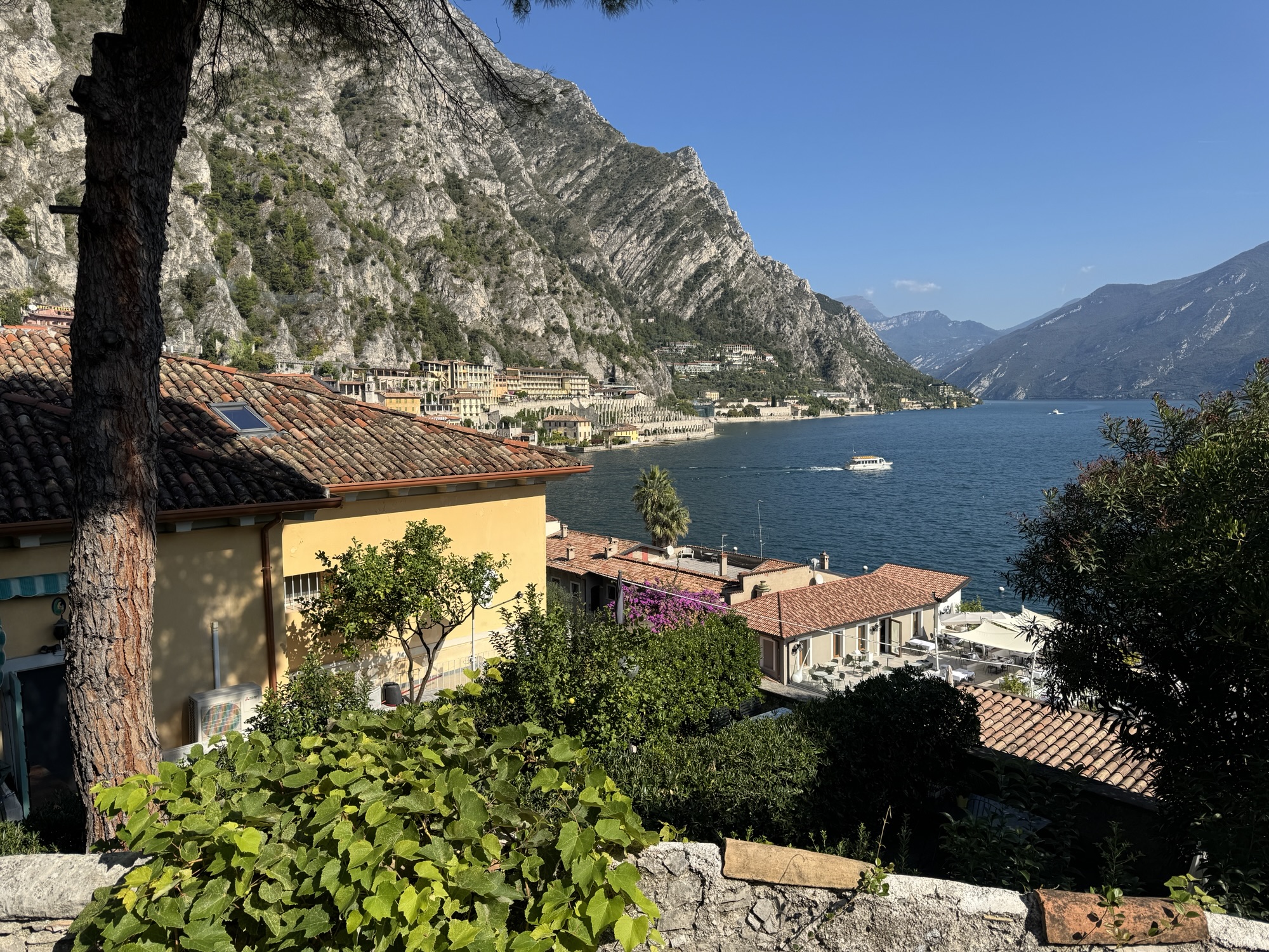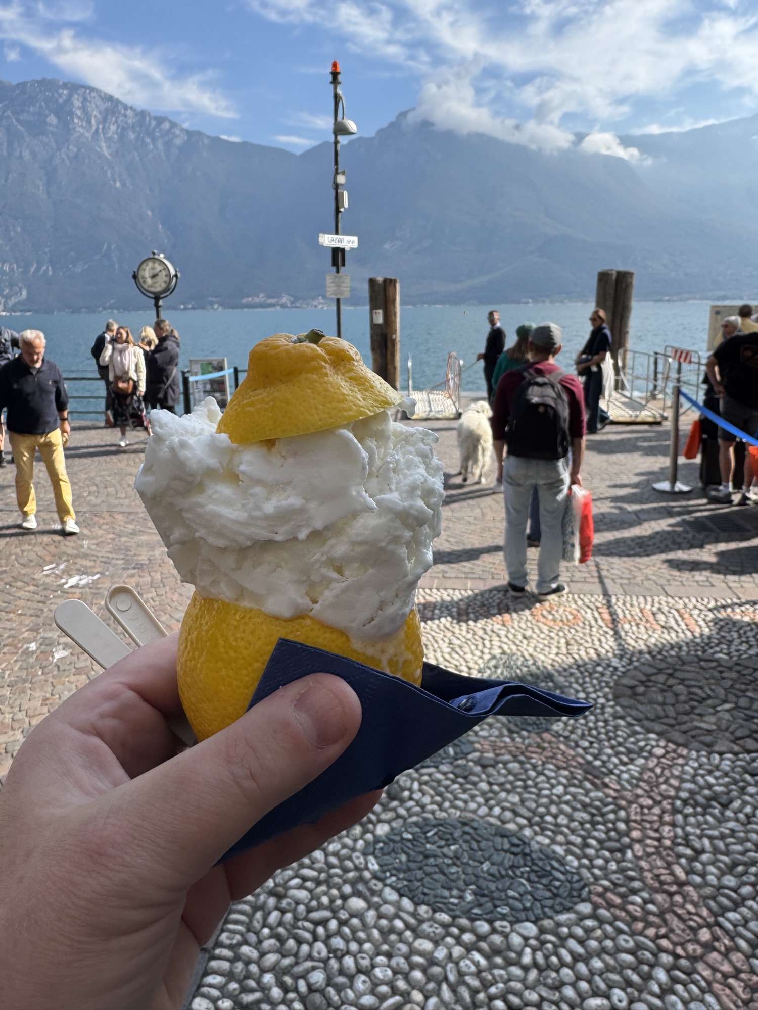 Today we took the ferry across Lake Garda to the village of Limone sul Garda. As its name suggests, Limone is famous for its lemon groves. Apparently, a few hundred years ago, Limone used to trade their lemons for Malcesine’s olives and olive oil. As a result, lemons became a kind of currency in the area. Even today, Limone is “all in” on their lemon branding. You can buy lemons, lemonade, limoncello, even lemon stuffed with lemon sorbetto. #travel #food