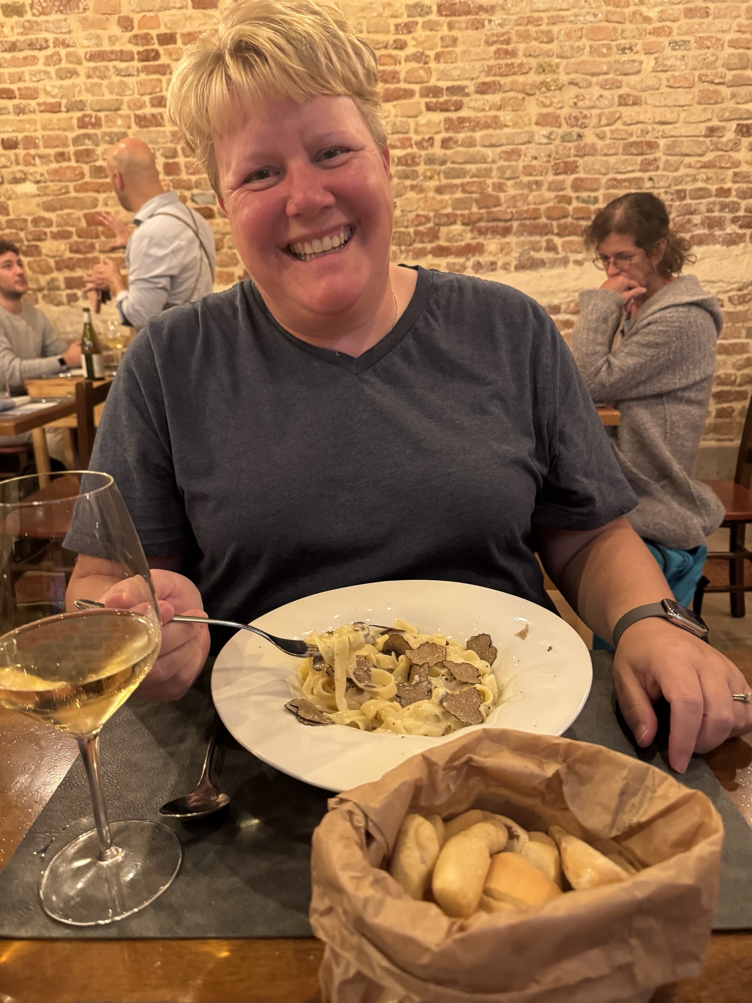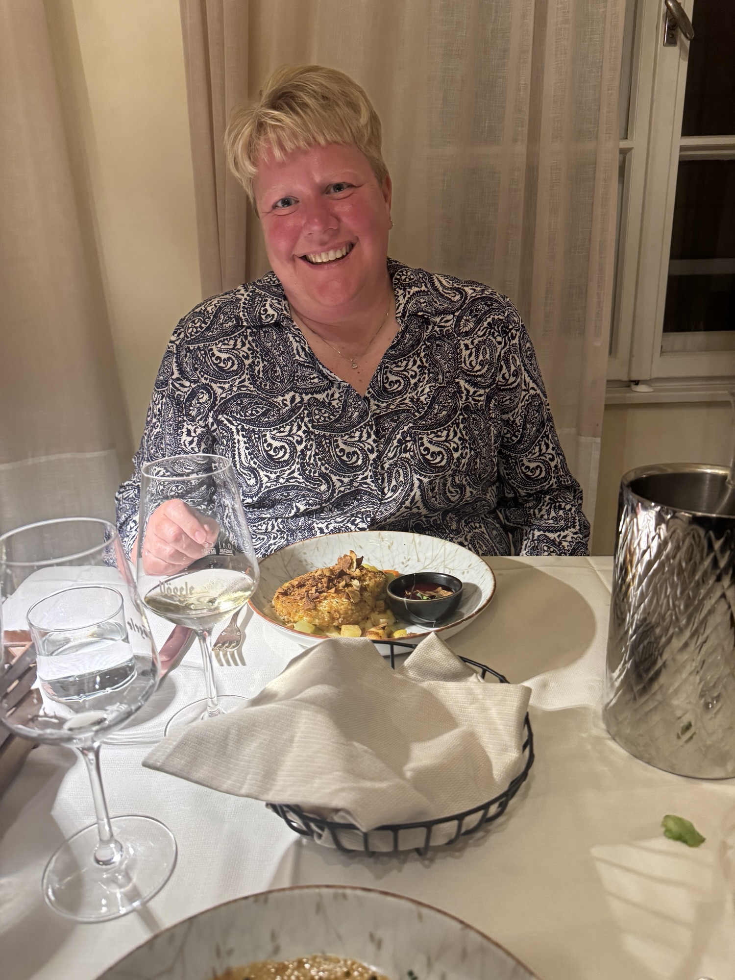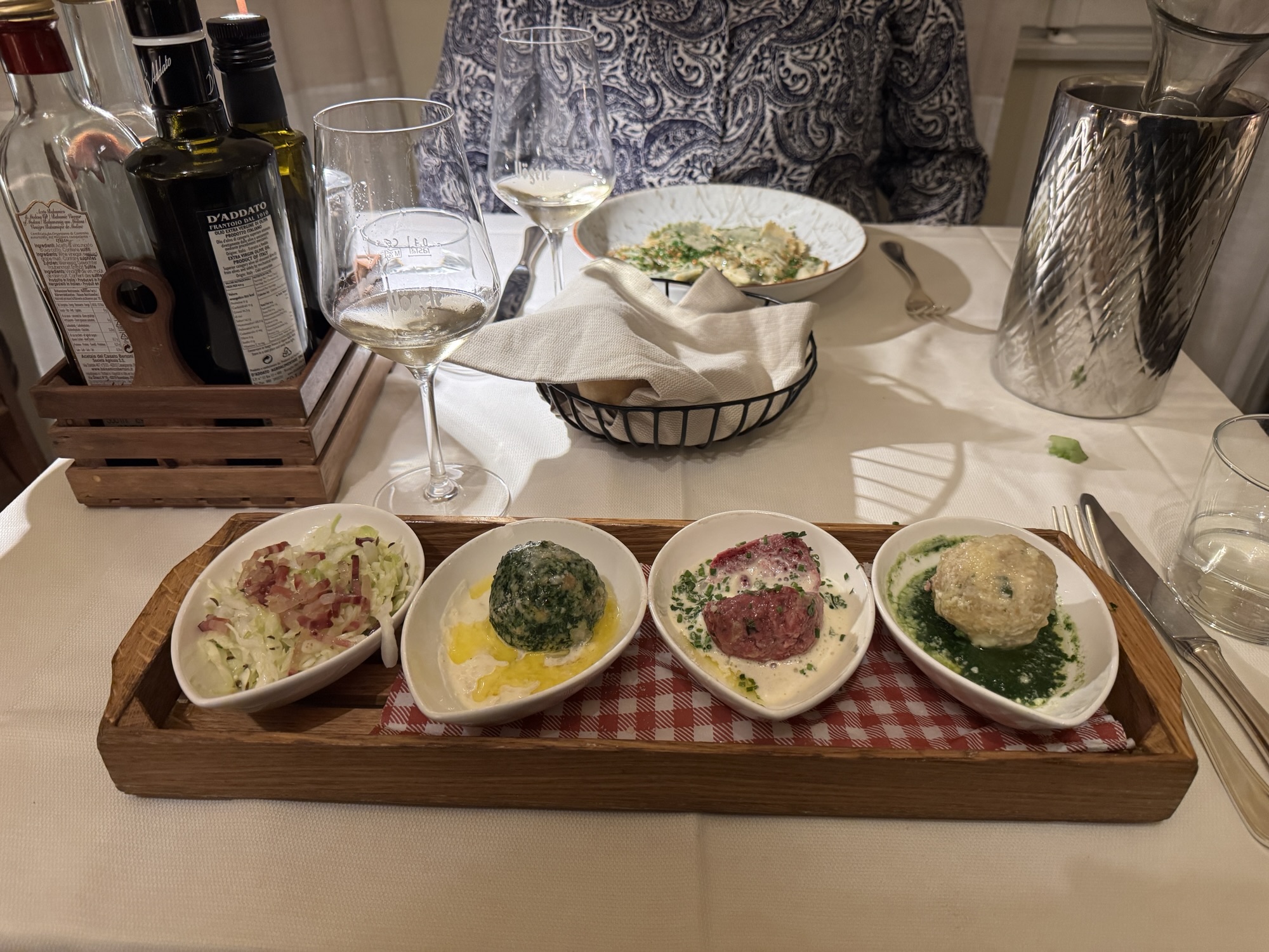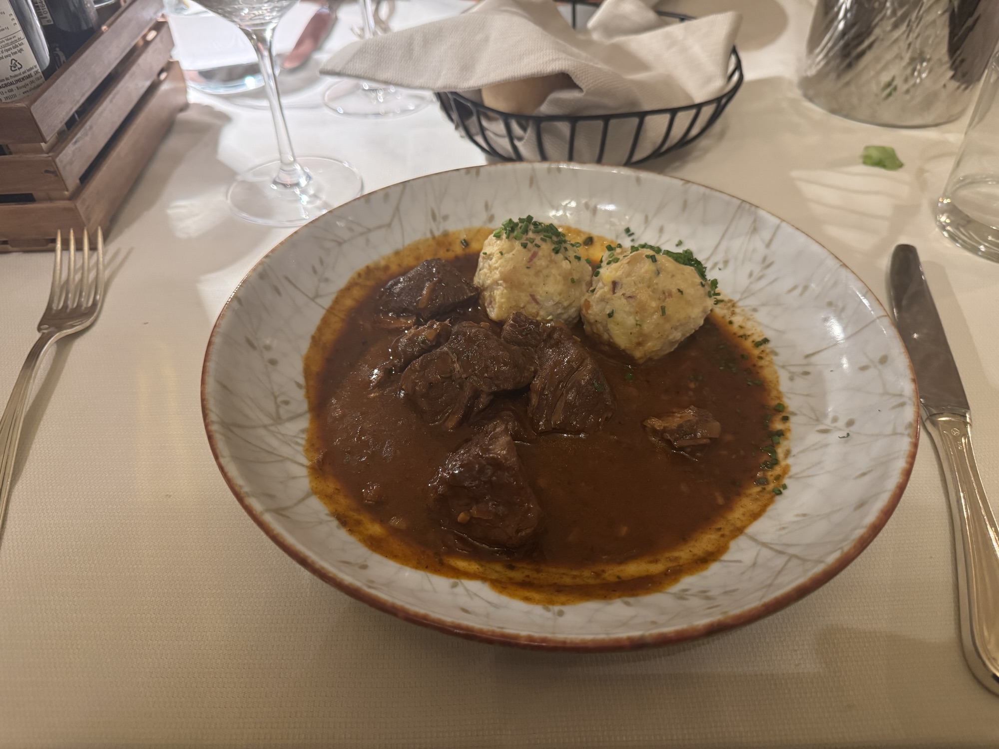 Yesterday evening we had an excellent dinner at Vögele (https://www.voegele.it). They serve mostly German and Austrian food (befitting the local taste), with the occasional ravioli and risotto thrown in. An interesting twist is that they seemed to only serve wine by the 1/2 liter in carafes. But this wasn’t simple vino de la casa. This was very good wine from producers I recognized (like Produttori del Barbaresco).I got the Knödel and Goulash. They were delicious. #travel #food #wine